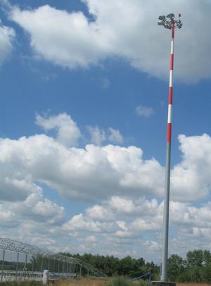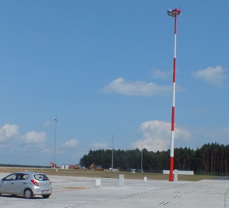 - Oświetlenie ogólne i przeszkodowe płaszczyzny postoju 8 samolotów kodu C,D i E, umieszczone na masztach 16-25 m z opuszczanymi koronami.